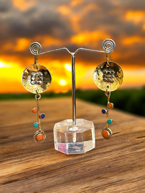 Boucle d'oreille ethnique en laiton, corail, turquoise et lapis-lazuli